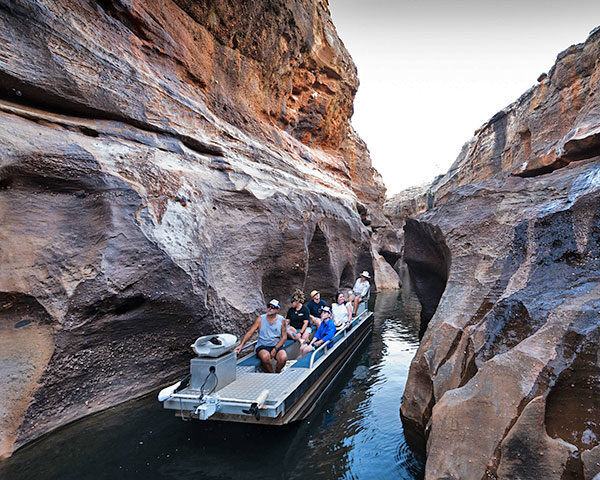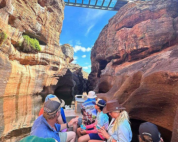 Snap a selfie and tick Cobbold Gorge off your Bucket List! The best way to grasp the uniqueness of this narrow gorge with its majestic 30-metre sheer walls from the bottom of the water to the top of the escarpment is to get up-close-and-personal with it. The 3-hour tour with your Savannah Guide includes a circular interpretive guided walk to the escarpment, providing an informative insight to the geology of the rugged sandstone formations and the chance to look down into the gorge structure as you cross the glass bridge, plus a boat cruise where you glide on custom-made, electric powered boats in almost eerie silence, ensuring minimal disturbance to wildlife. You might even spot one of the large population of resident freshwater crocodiles!